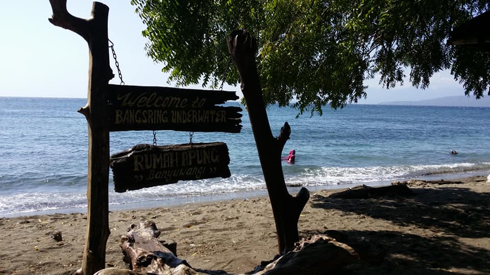 Oke, lanjut. Jadi ceritanya, akhir pekan lalu kami sekeluarga jalan-jalan ke pantai yang berjuluk Bangsring Underwater. Dari rumah ibuku didekat kota Jajag, membutuhkan waktu 2 jam menuju sana. Bangsring sendiri berlokasi di jalan Situbondo-Banyuwangi. Ikuti saja GPS, tempatnya mudah ditemui. Tapi hati-hati saat sudah masuk ke lokasi, sebelum menuju pantai, kita akan diminta belok kiri oleh GPS. Ikuti saja petunjuk tersebut, sebab jika kita nekad lurus malah masuk ke pantai lain dan mesti bayar retribusi Rp10 ribu. Saat saya di sana ada seorang ibu yang mengeluh pada penjual hotdog, “Ternyata pengelola pantai yang sana (si ibu menunjuk arah pantai sebelum Bangsring) beda dengan yang sini, ya, pak? Saya tadi sudah masuk sana dan bayar Rp10 ribu, eh ternyata bukan Bangsring yang saya tuju!”