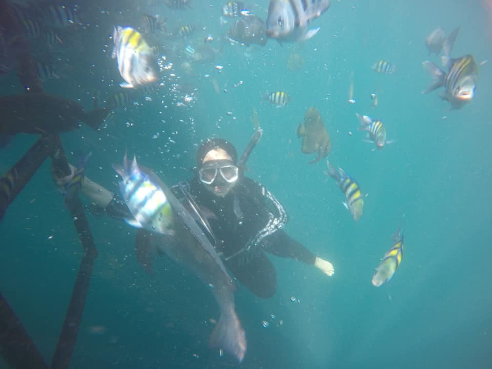 Selain menikmati pemandangan ikan-ikan yang hilir mudik, Pak Ipin juga mengajari kami menyelam singkat, dengan berpegangan di tangga rumah apung. Saya melepaskan pelampung dan snorkel, lalu menyelam singkat sambil memberi makan ikan. Jadilah foto yang ciamik bersama ikan-ikan yang menawan.