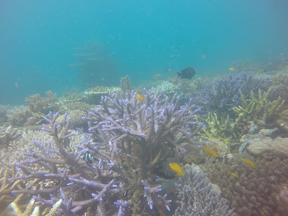 Petualangan berlanjut dengan berenang ke area yang memiliki terumbu karang mempesona yang berjarak kurang lebih 5 meter dari rumah apung. Di sana jelas sekali terumbu-terumbu karang beraneka bentuk dan warna. Sayang sekali tidak ada program eduksi untuk mengenali jenis terumbu karang dan namanya. Seandainya sebelum snorkeling pengunjung bisa melihat jenis-jenis terumbu karang, bentuk dan warnanya tentu akan lebih menarik. Jadi sembari melihat-lihat kita bisa mengenali terumbu karang yang keras dan lunak, yang bentuknya lebar, runcing, dan lain-lain.