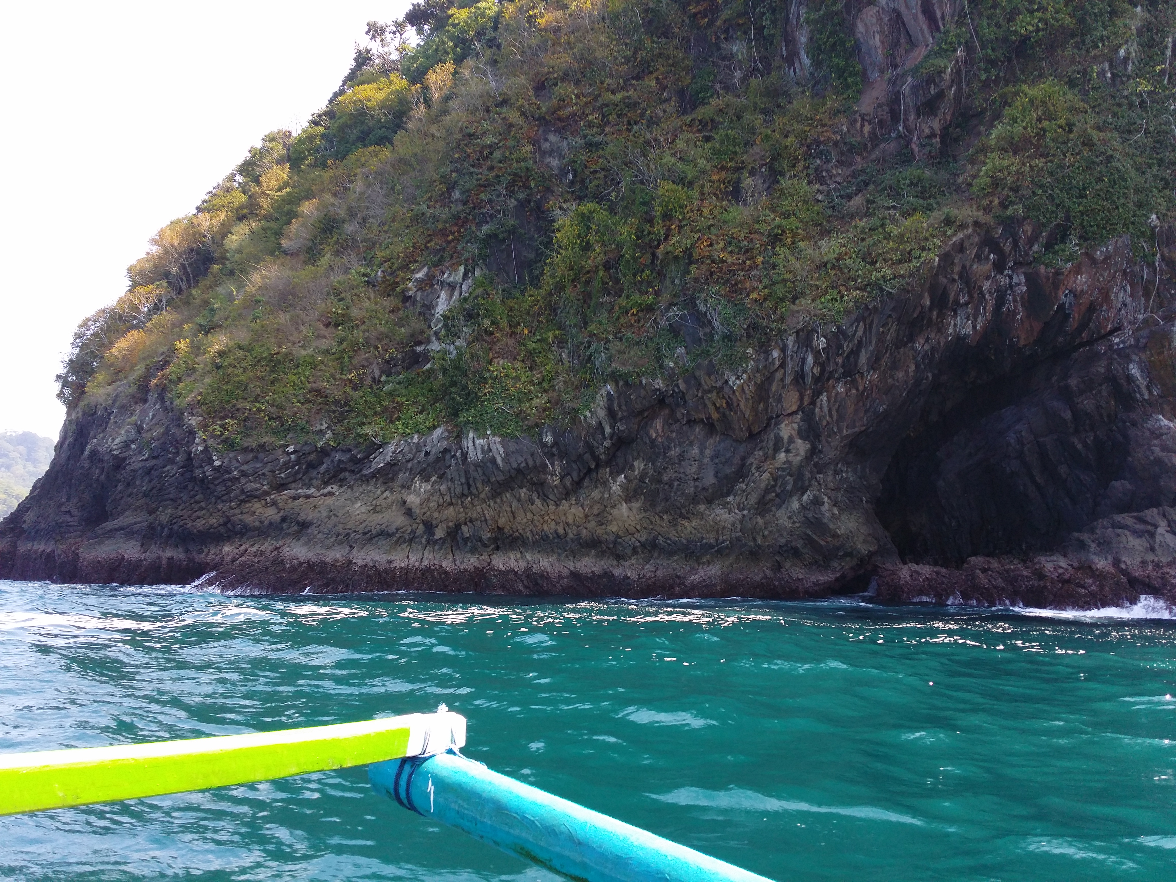 Singkat cerita, kami menaiki perahu menuju Teluk Ijo. Lama perjalanan kurang lebih 15 menit. Kami mengarungi laut yang biru jernih dengan deretan bukit terjal hijau di sisi kanan. Laut terlihat dalam karena tidak terlihat dasarnya. Ombak tidak terlalu besar namun perahu tetap bergoyang-goyang. Anak saya paling kecil, Ihsan, menangis saat pertama memasuki perahu. Tangisnya makin kencang saat perahu berjalan. Setelah beberapa saat dia berhenti menangis dalam dekapan suami saya. Ini memang pengalaman kedua dia naik perahu dalam jangka waktu seminggu. Semua penumpang memakai jaket pelampung untuk keamanan.