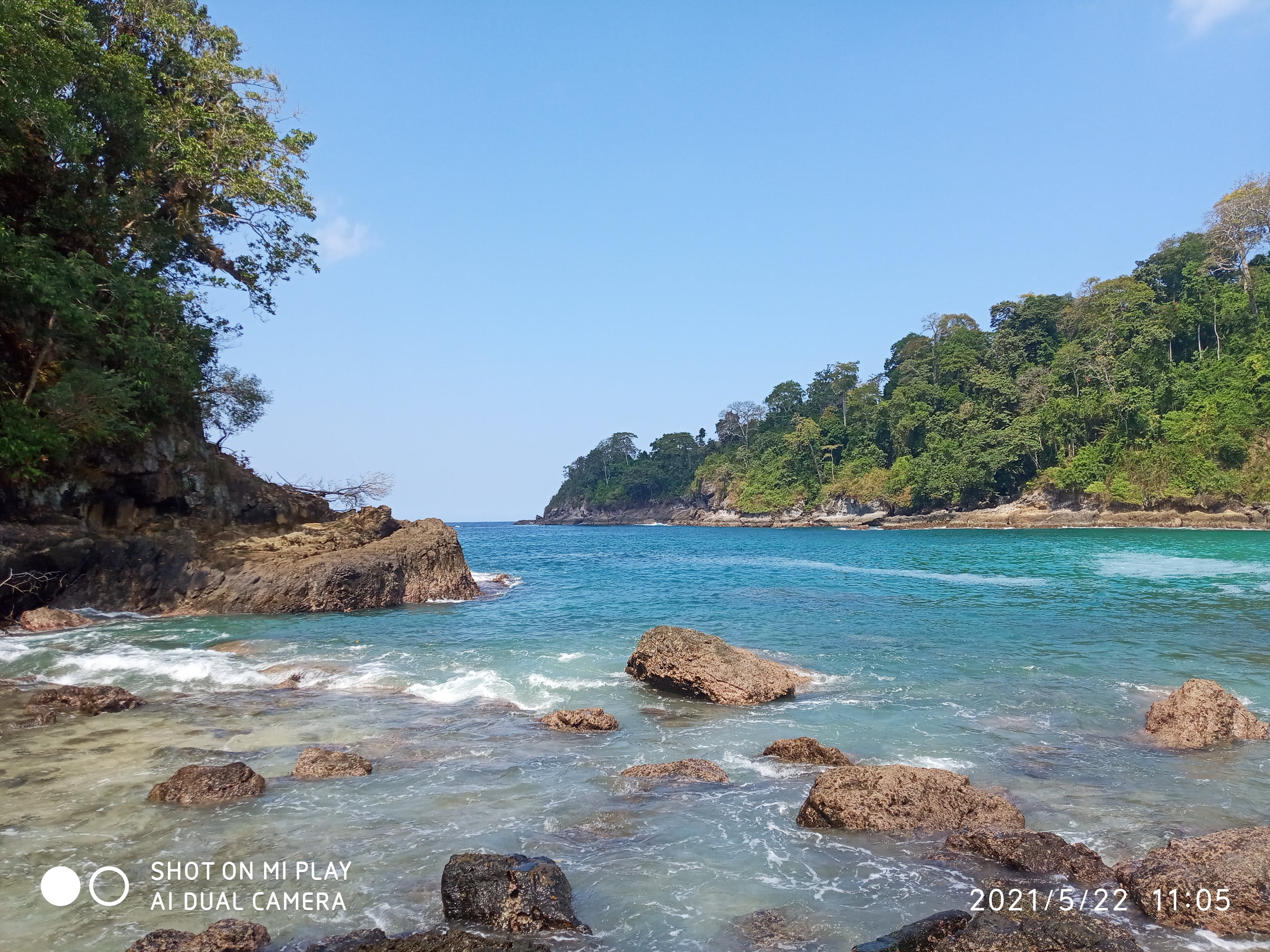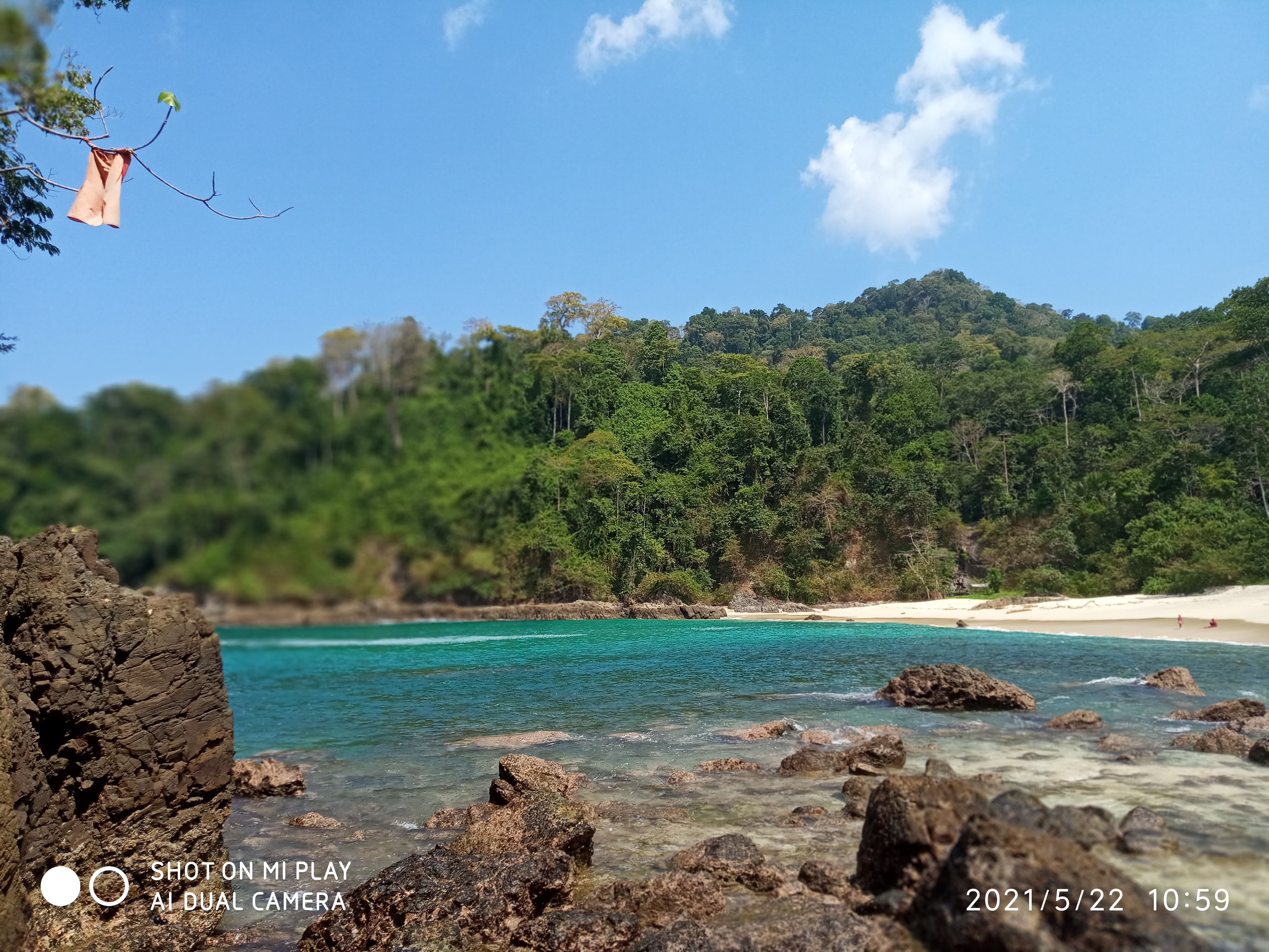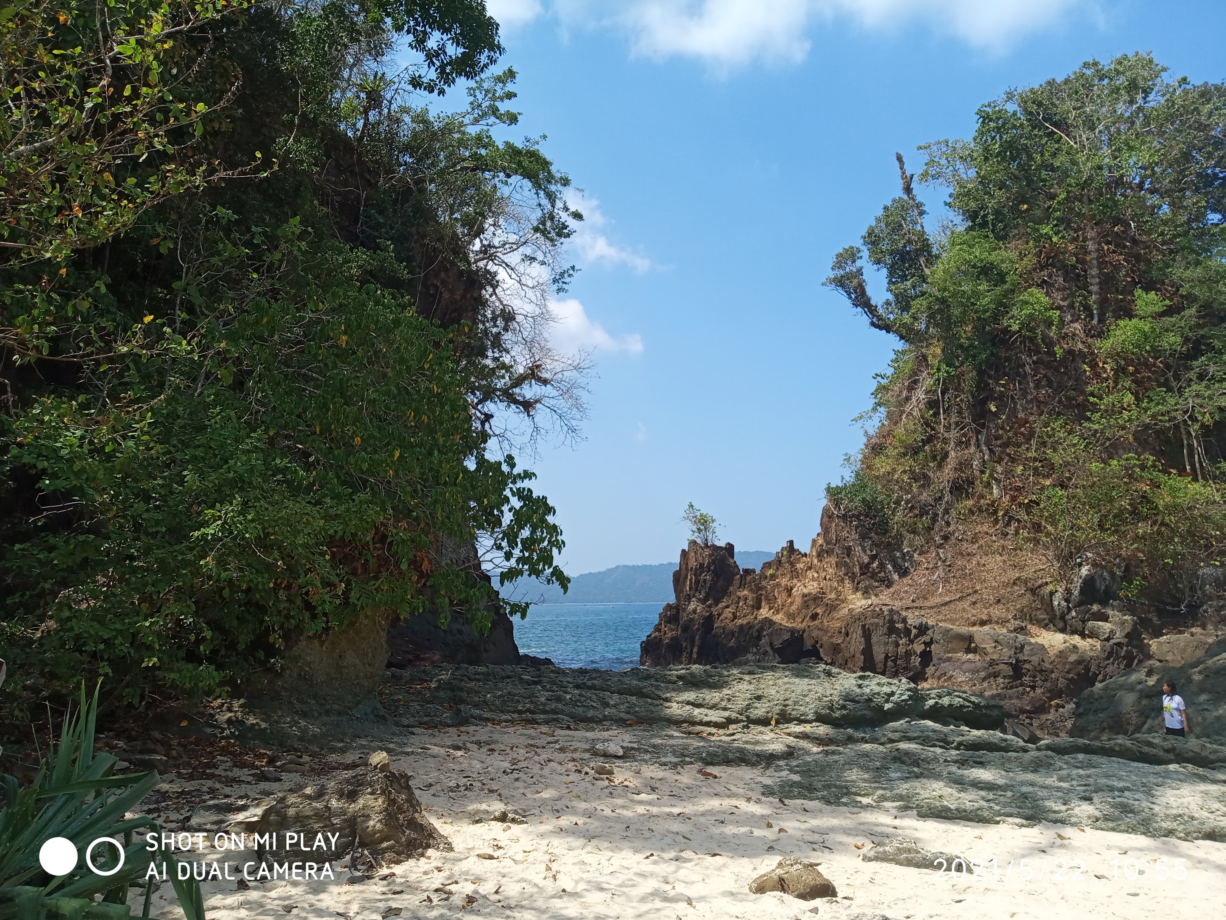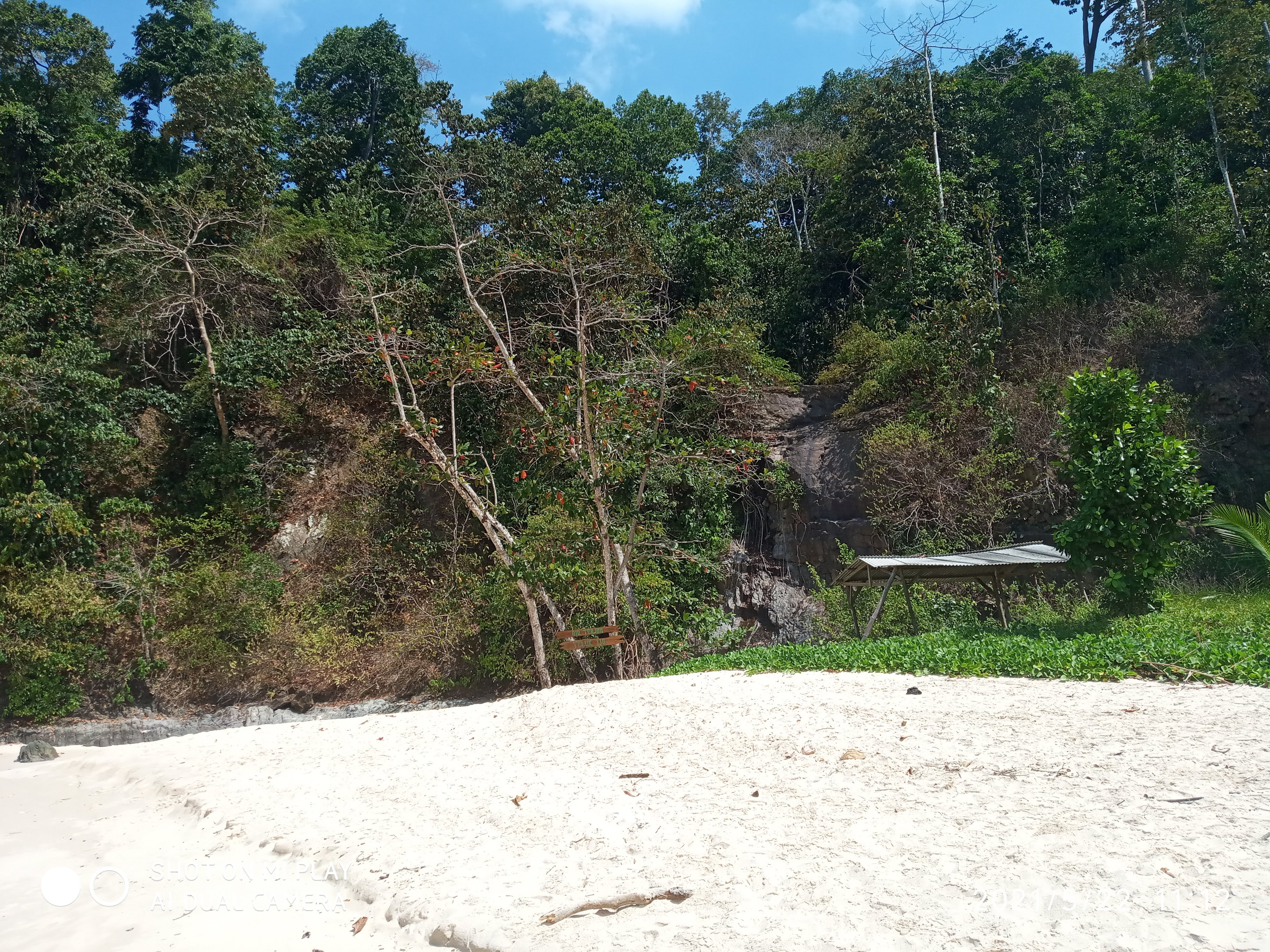 Tapi kekhawatiran Sofie tidak terbukti. Tak lama setelah kami sampai, datang serombongan anak muda dari arah hutan. Mereka langsung mengambil tempat di sisi utara yang penuh batu karang. Suara tawa riang dan antusiasme mereka mengambil foto terdengar dari kejauhan. Kami duduk-duduk santai, anak-anak bermain pasir dan ombak. Saya mengeksplorasi pantai. Sisi utara pantai memang spot pertama yang dijangkau pengunjung yang datang berjalan kaki. Ada batu-batu besar, dengan air jernih dan ikan-ikan kecil berenang di sana. Sisi selatan, juga dipagari dengan karang terjal. Ada air terjun yang saat itu kering. Air terjun ini hanya ada airnya di musim hujan, sekitar bulan Desember-Februari. Ada bangku-bangku untuk duduk. Tidak ada kedai makan, toilet dan ruangan berganti pakaian.
