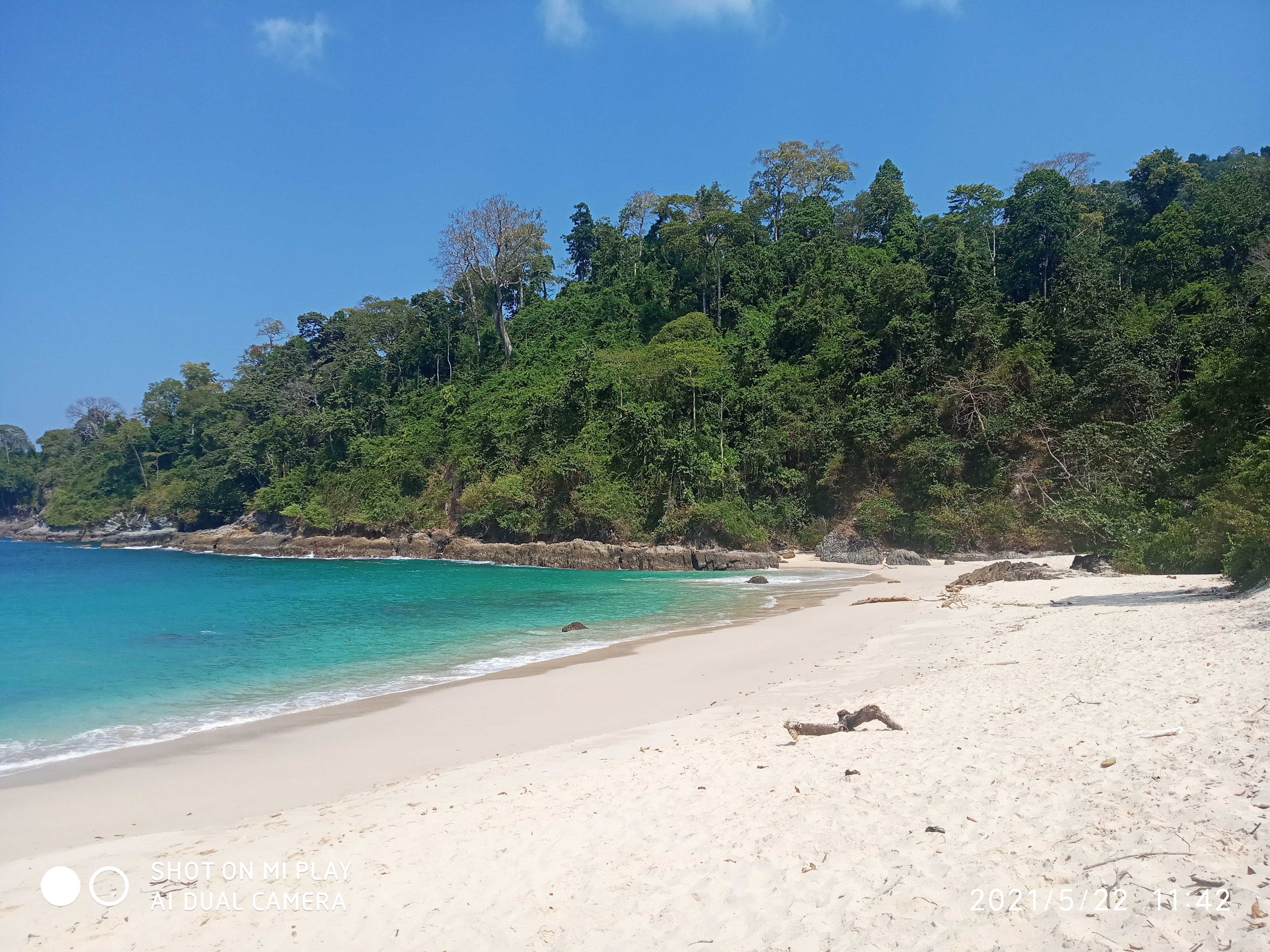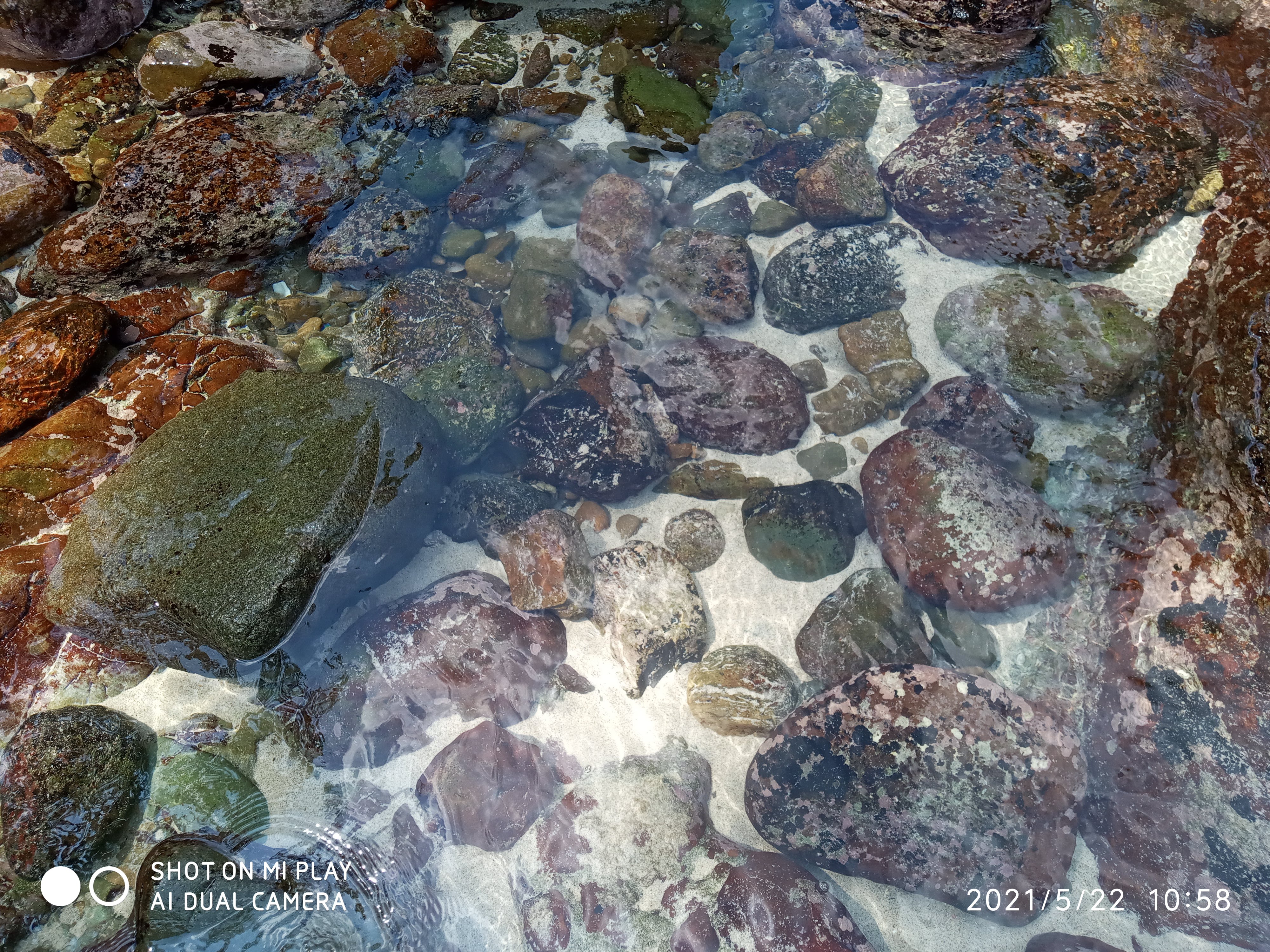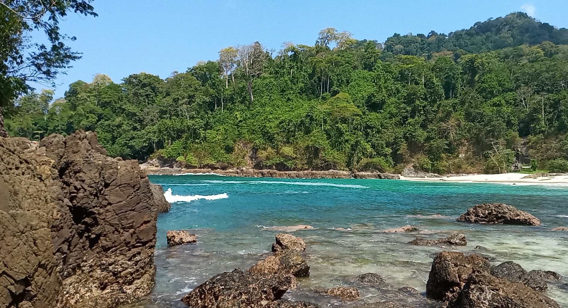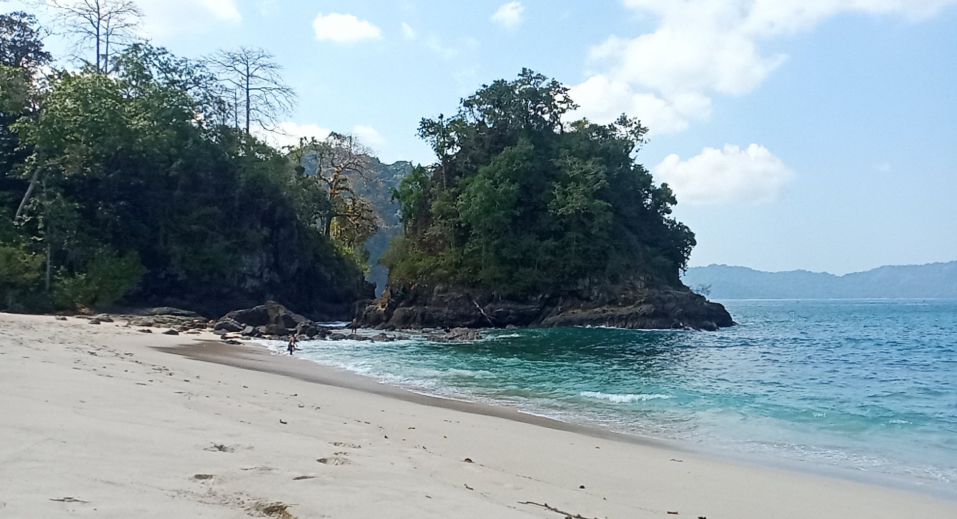 Tapi kekhawatiran Sofie tidak terbukti. Tak lama setelah kami sampai, datang serombongan anak muda dari arah hutan. Mereka langsung mengambil tempat di sisi utara yang penuh batu karang. Suara tawa riang dan antusiasme mereka mengambil foto terdengar dari kejauhan. Kami duduk-duduk santai, anak-anak bermain pasir dan ombak. Saya mengeksplorasi pantai. Sisi utara pantai memang spot pertama yang dijangkau pengunjung yang datang berjalan kaki. Ada batu-batu besar, dengan air jernih dan ikan-ikan kecil berenang di sana. Sisi selatan, juga dipagari dengan karang terjal. Ada air terjun yang saat itu kering. Air terjun ini hanya ada airnya di musim hujan, sekitar bulan Desember-Februari. Ada bangku-bangku untuk duduk. Tidak ada kedai makan, toilet dan ruangan berganti pakaian.