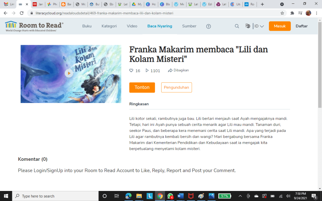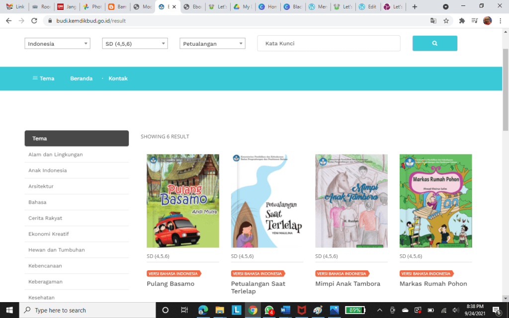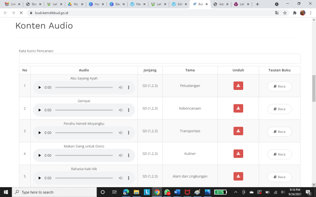 Saya belum lama memanfaatkan website ini. Isinya cukup lengkap dan menarik. Ada banyak pilihan buku digital dengan pilihan 3 bahasa: Indonesia, Inggris, dan Daerah. Ada juga pilihan buku berdasar jenjang PAUD, TK, SD Kelas bawah (1-3), SD kelas atas (4-6), SMP, SMA dan Umum. Kita juga bisa memilih buku berdasar temanya, misalnya Tokoh Indonesia, Petualangan, Alam dan Lingkungan, dan lain sebagainya. Oya ada juga koleksi audio berisi rekaman pembacaan buku yang mengingatkan saya saat mendengar cerita di radio puluhan tahun silam. Ada back sound musiknya juga, lho!