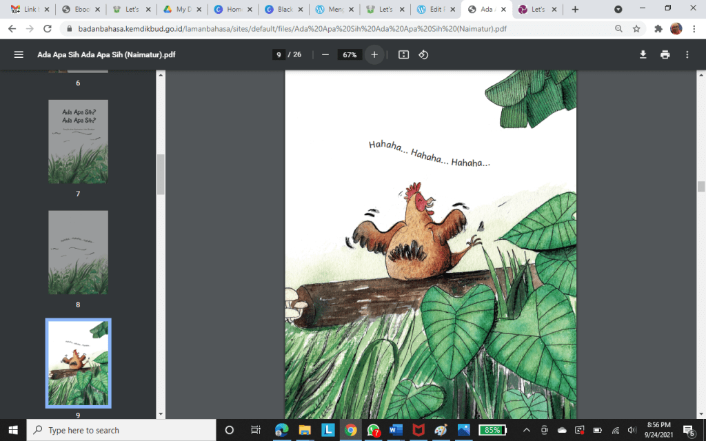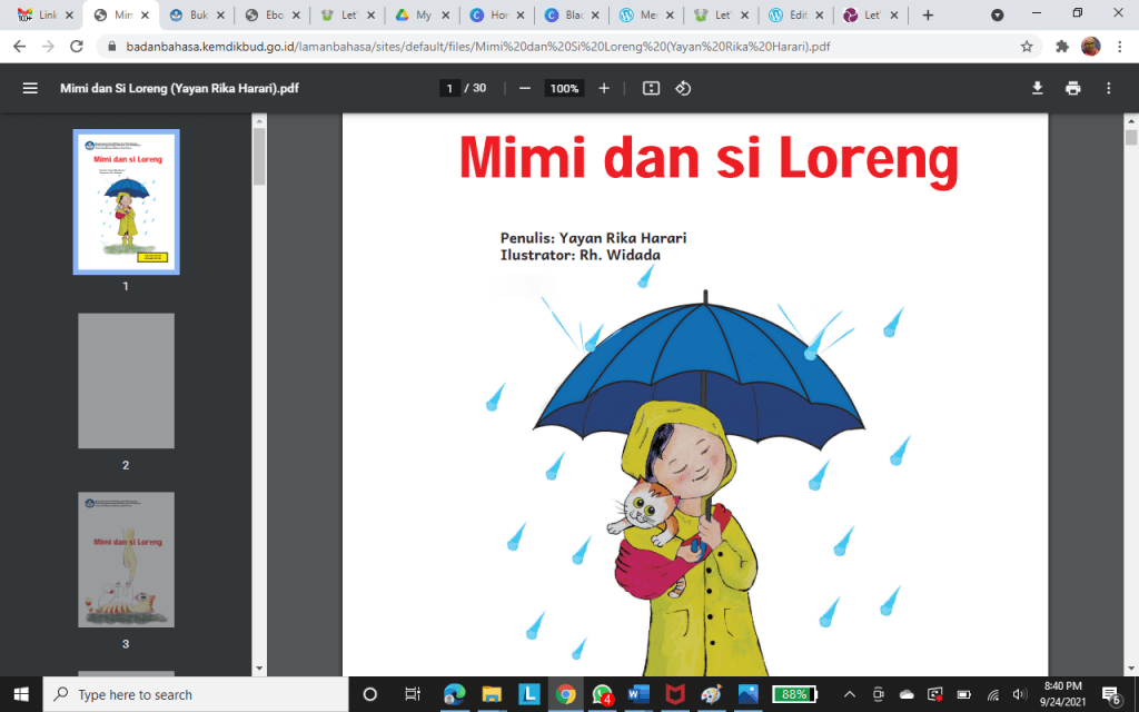 Buku bacaan di website ini dibagi dalam 3 kelompok besar, yakni GLS (Gerakan Literasi Sekolah), GLK (Gerakan Literasi Keluarga), dan GLM (Gerakan Literasi Masyarakat). Kita tinggal pilih salah satu buku. Saat kita klik gambar buku, layar laptop atau hp kita akan diarahkan pada buku berbentuk PDF. Berikut tampilannya: